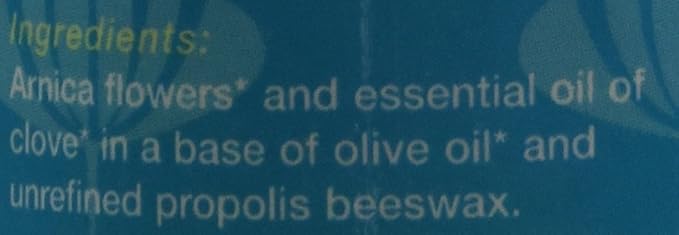 - INGREDIENTS: Certified organic arnica flowers and certified organic essential oil of clove infused in a base of certified organic olive oil and unrefined propolis beeswax. CAUTION: Do not use arnica salve on broken skin.