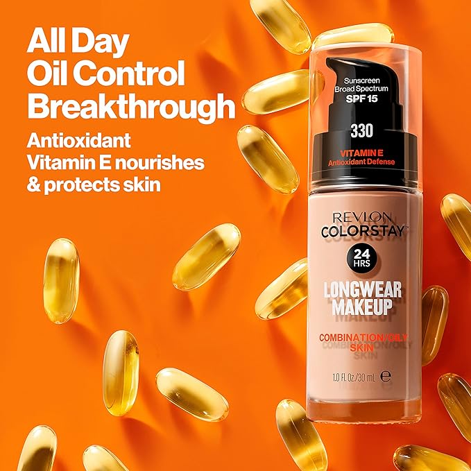 Revlon Liquid Foundation, ColorStay Face Makeup for Combination & Oily Skin, SPF 15, Longwear Medium-Full Coverage with Matte Finish, Caramel (400), 1.0 Oz