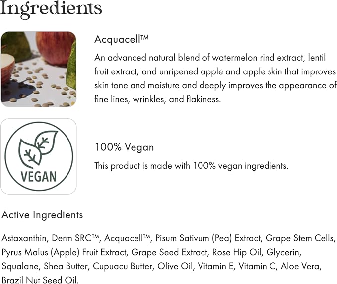 - Active Ingredients : vitamin_c, vitamin_e, Astaxanthin, Derm SRC™, Acquacell™, Pisum Sativum (Pea) Extract, Grape Stem Cells, Pyrus Malus (Apple) Fruit Extract, Grape Seed Extract, Rose Hip Oil, Glycerin, Squalane, Shea Butter, Cupuacu Butter, Olive Oil, Vitamin E, Vitamin C, Aloe Vera, Brazil Nut Seed Oil. vitamin_c, vitamin_e, Astaxanthin, Derm SRC™, Acquacell™, Pisum Sativum (Pea) Extract, Grape Stem Cells, Pyrus Malus (Apple) Fruit Extract, Grape Seed Extra… See more