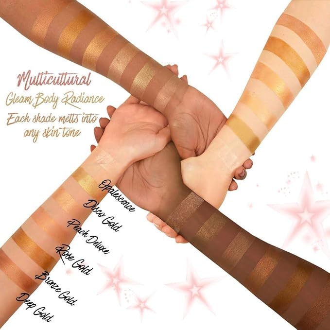 - BRONZE GOLD: Bronze Gold creates a gorgeous golden goddess finish instantly giving skin a sun tanned glow with golden/orange undertones. The perfect shade to achieve a faux tan or bronzed glow for all skin tones. Use as a primer for face, mix with foundation or all over body for perfected glowing skin. Gleam’s lightweight moisturizing makeup will help diminish minor imperfections while hydrating skin and improving skin appearance.