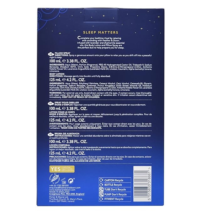 - Lavender Sleep Duo: Our Feather and Down Relax & Unwind Gift Set includes a 100ml pillow spray and a 125ml body lotion, both infused with the calming scents of lavender and chamomile essential oils