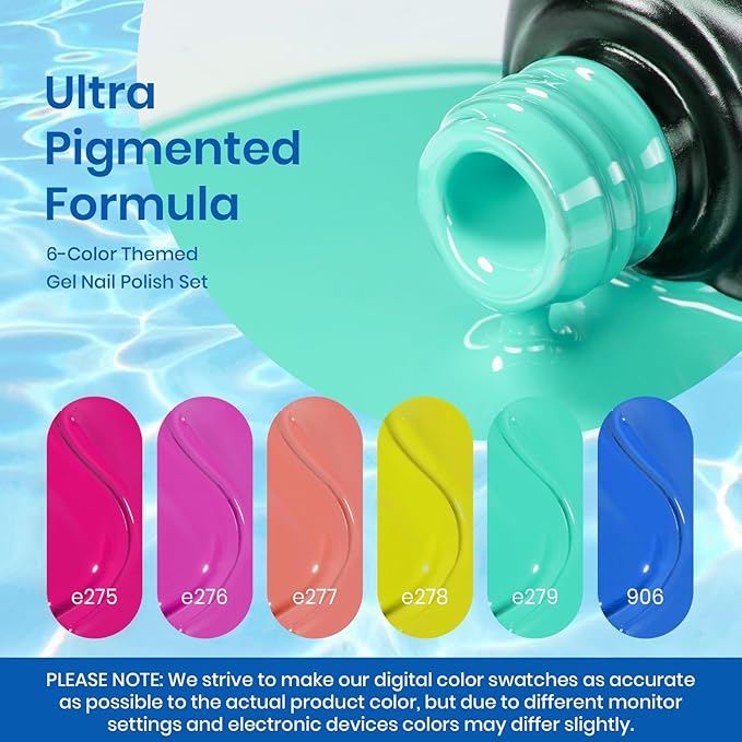 - 【New Trend Gel Polish Set】:beetles nail gel polish, This is a set of neon bright colors gel nail polish which are ideal for beach or pool party! These popular and trendy nail colors are suitable for all year around.Color Number is: e275-e276-e277-e278-e279-906.