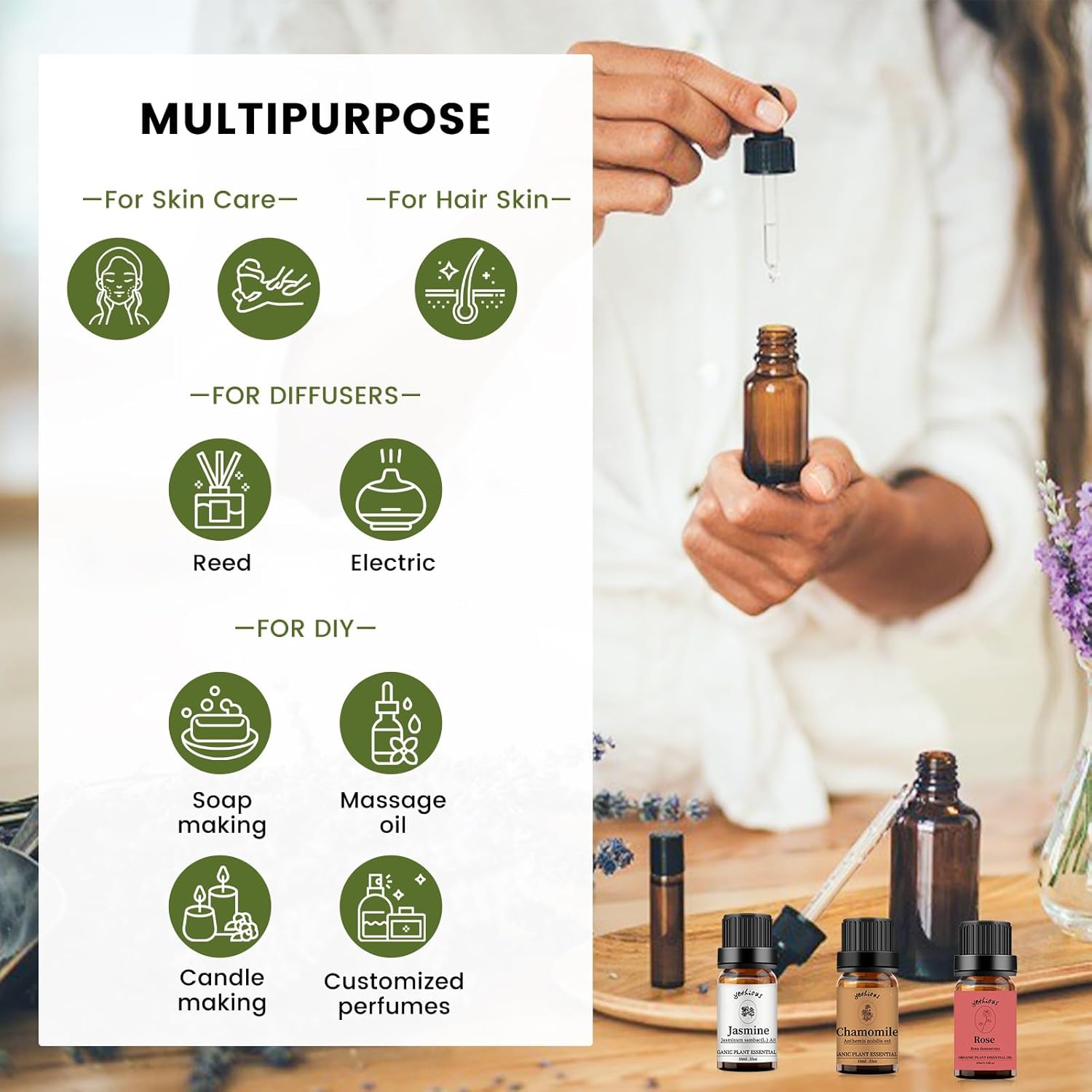 - Rose pure oil extracted from rose, unique rose fragrance create a comfortable, sweet, romantic atmosphere. Jasmine pure oil extracted from jasmine, unique flower fragrance create a comfortable. Chamomile pure oil extracted from chamomile, unique flower fragrance create a comfortable.