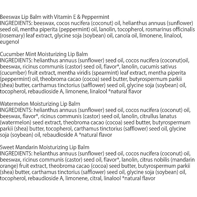 - FOUR REFRESHING FLAVORS: Delight the senses with Beeswax, Cucumber Mint, Watermelon and Sweet Mandarin flavors that will encourage you to apply flavored lip balm over and over again