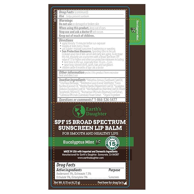 - BROAD SPECTRUM SUN PROTECTION – With SPF 15 (sun protection factor), our Earth’s Daughter SPF lip balm protects against both UVA and UVB rays. This broad spectrum protection combined with our premium organic moisturizing ingredients provides the ultimate all season chapped lip stick.
