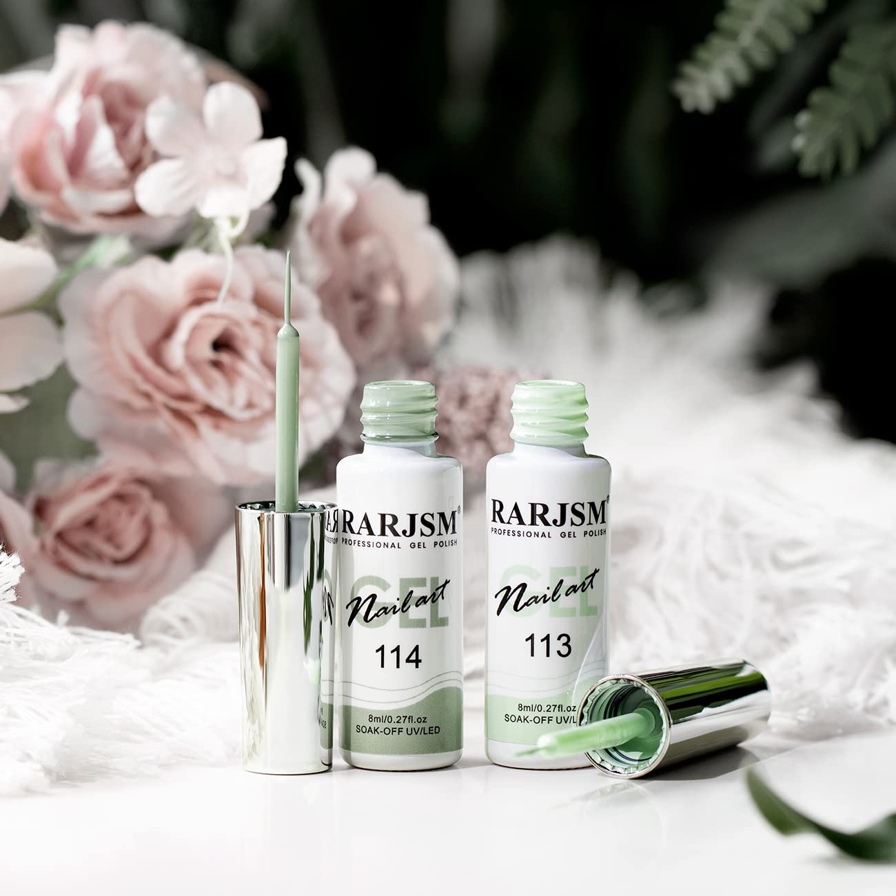 - PASTEL GREEN LINER GEL POLISH:Nail color trends may come and go, but pastel nails never go out of style.Having pastel green nails, especially during spring, may drastically change the way your hands look. RARJSM spring green liner art gel polish 2pcs set is pastel shades out there that you will never get bored of trying new ones,and these colors compliment almost every skin tone