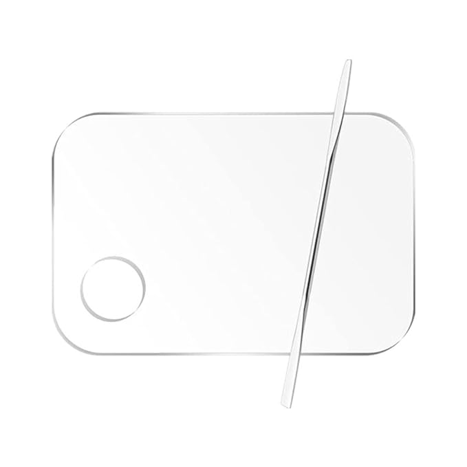- Palette size: 10 x 15cm; Spatula length: 15cm; Hole diameter: 2cm; Color: Clear, silver; ●●●Note: Please peel off the protective film on the surface before using the palette