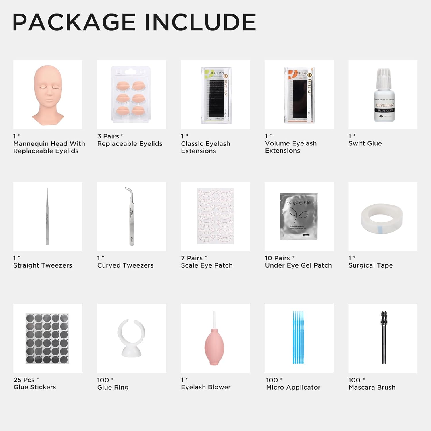 - ✅Eyelash Extension Kit: This eyelash extension kit includes 1 * mannequin head; 3 pairs * replaceable eyelids,1 * classic eyelash extensions, 1* volume eyelash extensions, 1 * swift glue, 1 * straight tweezers, 1 * curved tweezers, 10 pairs * under eye gel patch, 7pairs * scale eye patch, 1 * surgical tape, 25pcs * glue stickers, 100 * glue ring, 1 * eyelash blower, 100 * mascara brush, 100 * micro applicator.