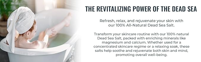 - Nourishing Skincare: Experience the benefits of our Dead Sea Salt, featuring a blend of over 20 natural minerals, including magnesium and calcium. Enhance your skincare routine with a product designed to help maintain the skin's natural moisture and balance.