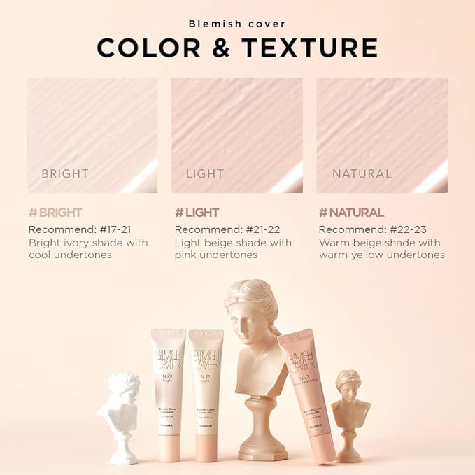 - FULL COVERAGE CONCEALER: Hanskin Blemish Cover is full coverage, semi-matte finish concealer that perfectly covers dark circles, discoloration, pigmentation, redness, scars, and other blemishes.