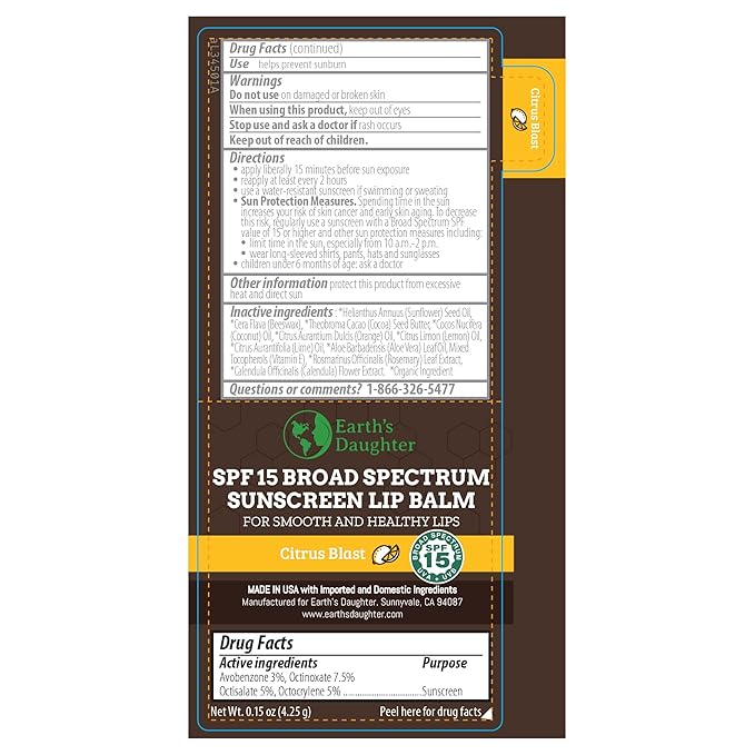 - BROAD SPECTRUM SUN PROTECTION – With SPF 15 (sun protection factor), our Earth’s Daughter SPF lip balm protects against both UVA and UVB rays. This broad spectrum protection combined with our premium organic moisturizing ingredients provides the ultimate all season chapped lip stick.
