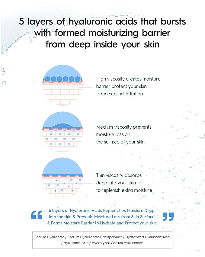 - HYDRATE & PROTECT - 5 layers of Hyaluronic Acids repenishes mositure deep into the skin & prevents moisture loss from skin surace and forms moisture barrier to hydrate and protect your skin