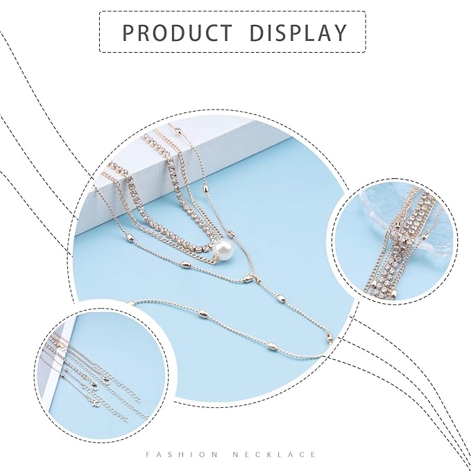 Bohemia Layered Y Lariat Choker Necklace Long Rhinestone Tennis Chain Necklace Floating Pearl Choker Necklace Gold Y Drop Necklace Chain Jewelry for Women and Girls