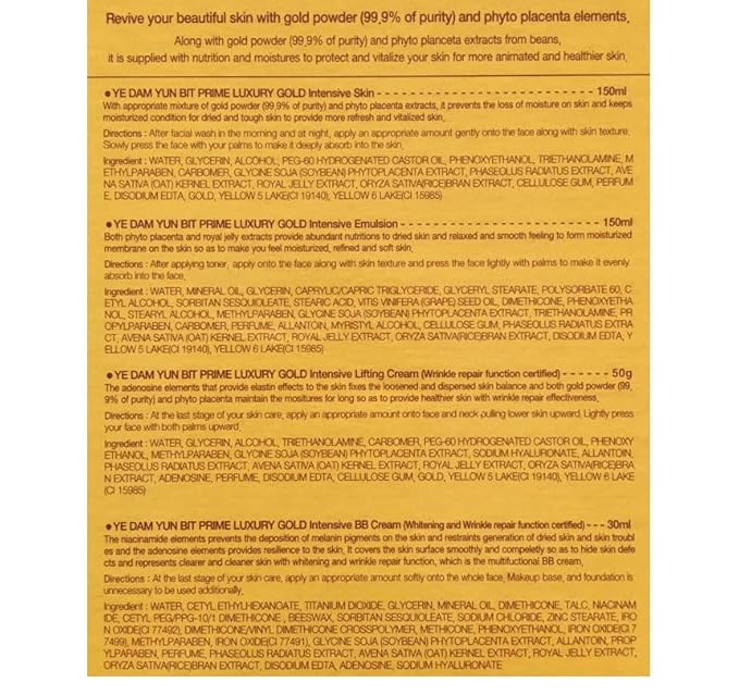 - Prime Luxury Gold Intensive Skin: With appropriate mixture of gold powder(99.9% of purity) and phyto placenta extracts, it prevents the loss of moisture on skin and keeps moisturized condition for dried and tough skin to provide more refresh and vitalized skin.