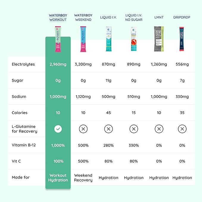 - Product Benefits : Waterboy Workout Hydration | 2,960mg Sugar Free Electrolyte Powder Packets | L-Glutamine + Vitamins | No Sugar, All Natural, Gluten Free | 15 Drink Stick Mixes (Strawberry Lemonade) Waterboy Workout Hydration | 2,960mg Sugar Free Electrolyte Powder Packets | L-Glutamine + Vitamins | No Sugar, All Natural, Gluten Free | 15 Drink Stick Mixes (Stra… See more