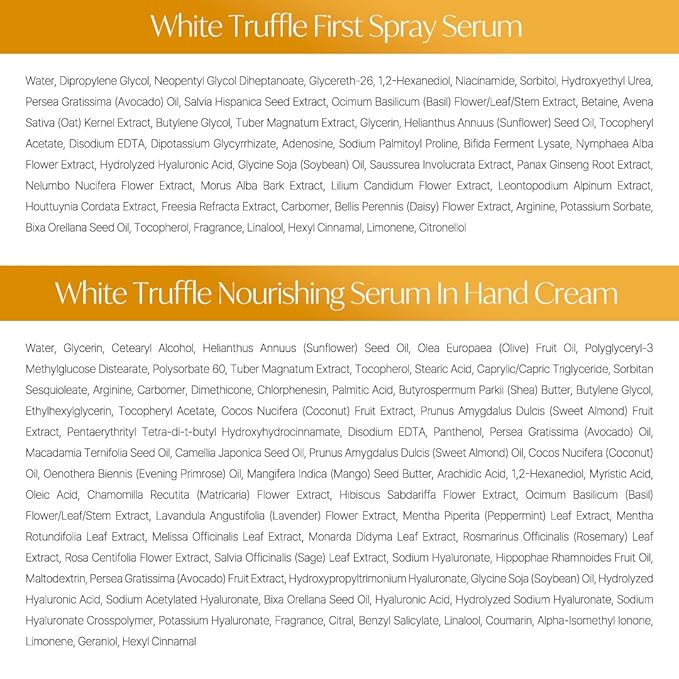 - The Gift Set includes the White Truffle First Spray Serum and Nourishing Serum in Hand Cream. Enjoy d'Alba's luxurious vegan skincare and experience the rich antioxidant benefits of White Truffle.