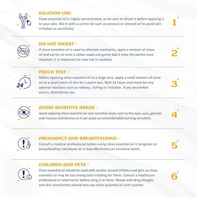 - Tooth Aches: Dilute clove essential oil in sweet almond oil at 1 drop of clove oil per milliliter of carrier oil. Dip a cotton swab and gently apply it to the affected area. Or Mix with 1-2 drops of clove essential oil to 60ml of warm water, vigorously swish between teeth for 30 seconds then spit out. Do not swallow