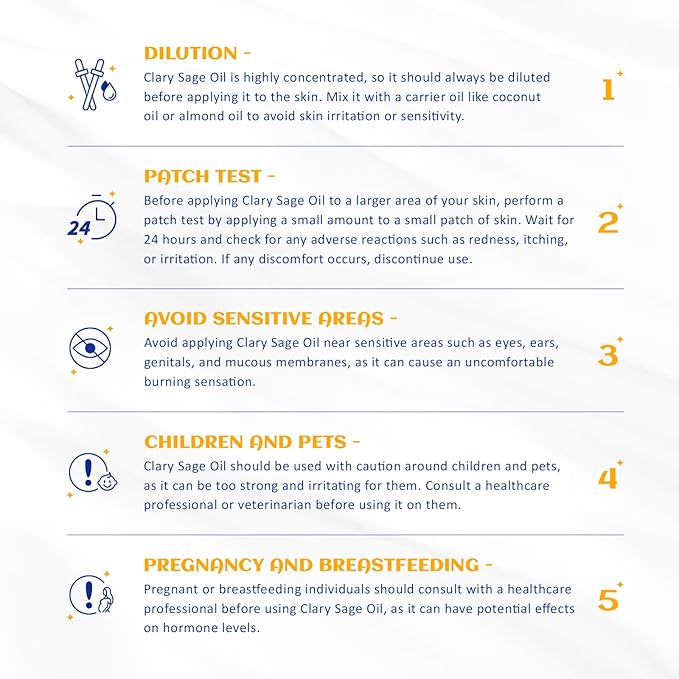 - Multiple Blend: Clary sage oil essential oil can be blended with Black Pepper, Bergamot, Cedarwood, Clove, Helichrysum, Lemon, Patchouli, Rose, Rosemary, Sandalwood, Vetiver essential oils. Always remember to test for skin sensitivity prior to widespread use and use on the feet when possible