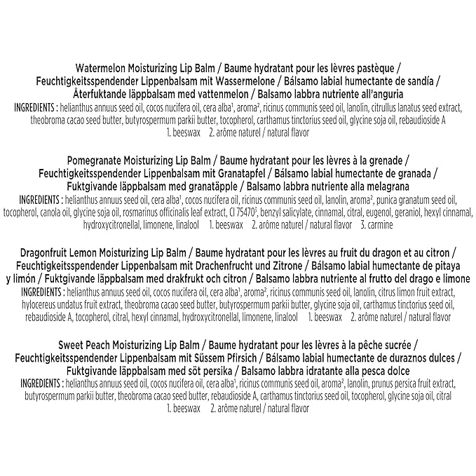 - BELOVED LIP MOISTURIZER FLAVORS: Each natural lip balm pack contains 4 lip balms in fresh flavors for everyday lip wear, including Sweet Peach, Watermelon, Pomegranate and Dragonfruit Lemon