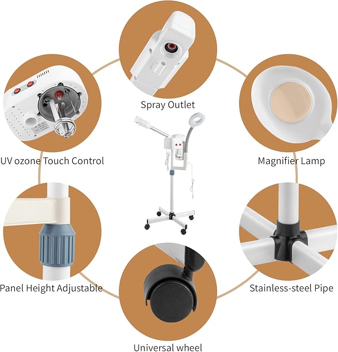 - Adjustable & Flexible: The casters of the beauty tool face steamer will not get stuck on the hair, and the movement is fast and smooth, and you can flexibly adjust the height of the beauty steamer machine and the angle of the beauty lamp when needed.