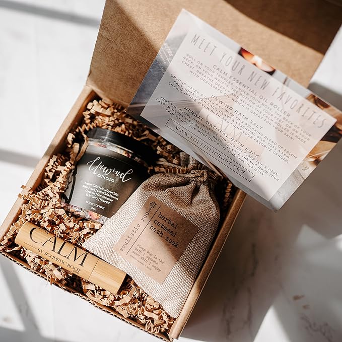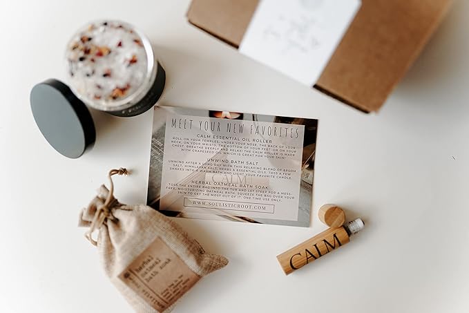 - Relaxing Bath Gift Set For Women with three premium self care products beloved by our customers for their relaxing and natural calm properties. Our spa gift set has been carefully curated to help her relax and unwind. It includes a Calm essential oil roller, organic oatmeal bath soak, and bath salts for women relaxing at the end of the day.