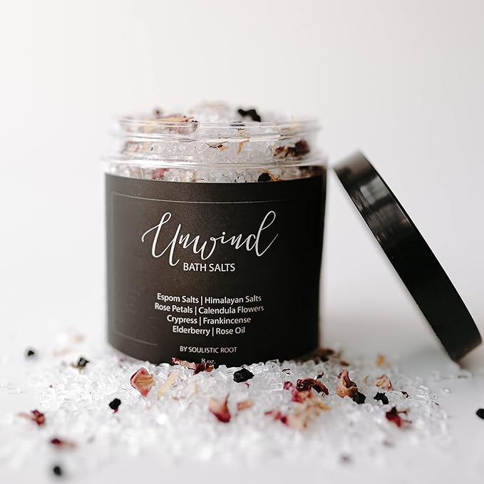 - Unwind Bath Salt - Epsom salts for soaking. These bath salts are a great bathtub accessory to elevate your bath, relax your body, and rejuvenate. Made with frankincense, cypress, rose essential oil, calendula flowers, rose petals, and elderberries. All of the natural ingredients are intentionally added to create a relaxing bath that nourishes your skin.