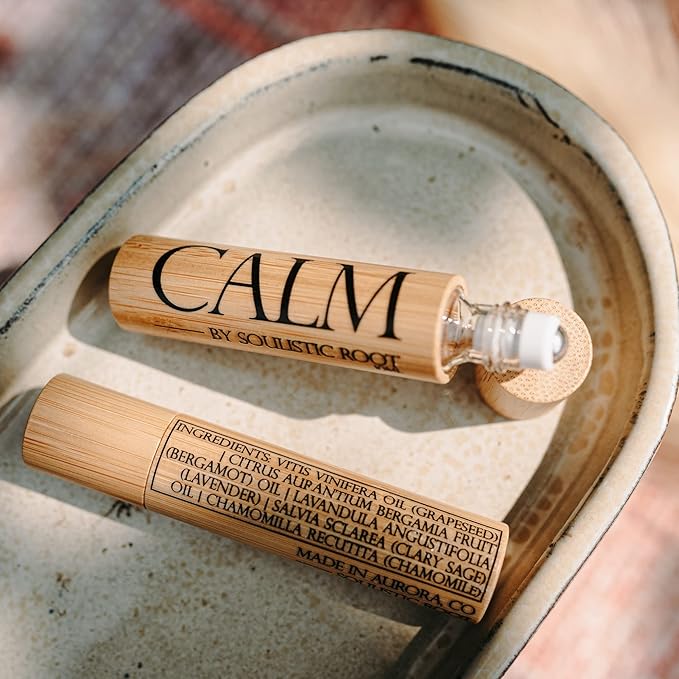 - Calm essential oil roll on - made with a calming blend of grapeseed oil, chamomile, clary sage, bergamot and lavender essential oil. This stress relief blend of essential oils can be applied throughout the day to help unwind and support relaxation.