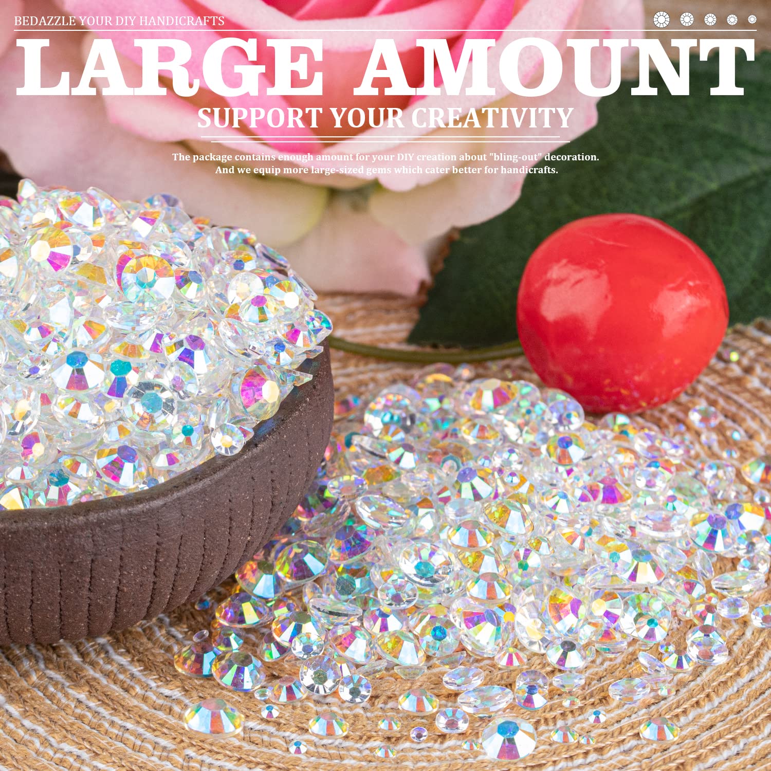 - đź’ŽWIDE APPLICATION -- These sparkling iridescent resin rhinestones are perfect for creating dazzling looks. Use them for face makeup, eye makeup, body art, 3D nail art or bedazzling DIY crafts like shoes, tumblers, mugs, bottles, phone cases, popsockets, scrapbooks, photo frames, diamond paintings, greeting cards, bags, glasses, guitars, keychains, hats, masks, hair clips, bracelets, wristbands, clothing, wedding dresses, and more. Apply it to what you want to bling!