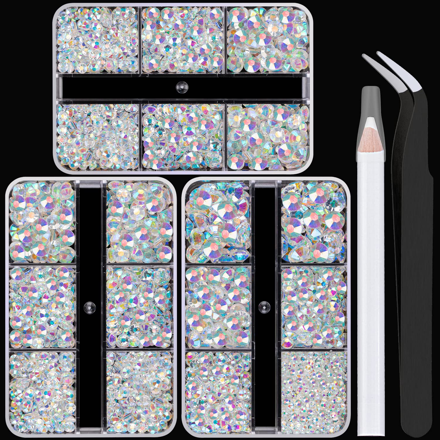 - đź’ŽPACKAGE CONTENT -- This resin rhinestone kit includes 3 boxes, each with 6 grids, featuring a variety of sizes: Box #1 contains 2mm x 1 grid, 3mm x 1 grid, 4mm x 1 grid, 5mm x 1 grid, and 6mm x 2 grids; Box #2 contains 3mm x 2 grids, 4mm x 2 grids, and 5mm x 2 grids; Box #3 is the same as Box #2. A tweezer and a pickup pencil are included for easy rhinestone picking. This set offers more large-size gems, making it perfect for DIY craft decorations, eye makeup, face makeup and nail art.