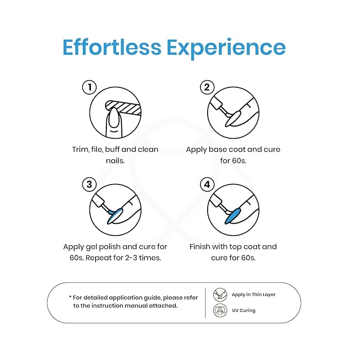 - 【Speed Curing with LED Nail Dryer Lamp】The gel polish set need to be cured under LED Nail Dryer . Base and Top coat required. Average for LED Nail Lamp 60-120 secs.