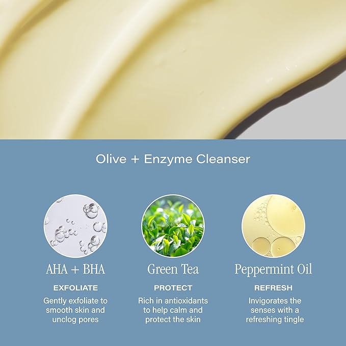 - AM + PM Facial Cleanser: This SKINN Green Tea + Mint Cleanser and Olive + Enzyme Cleanser Duo is a refreshing morning and soothing night time treatment that will leave your skin feeling clean around the clock. Includes (1) 4.0oz tube of Olive + Enzyme Cleanser and (1) 4.0oz tube of Green Tea + Mint Cleanser.