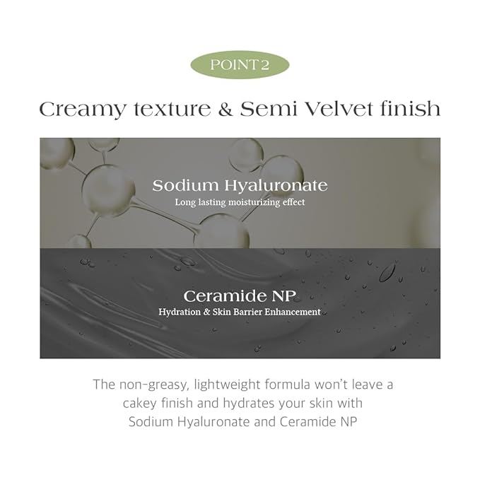- Moistrurizing fomula : It won't leave a cakey finish and hydrate your skin with Sodium Hyaluronate & Ceramide NP