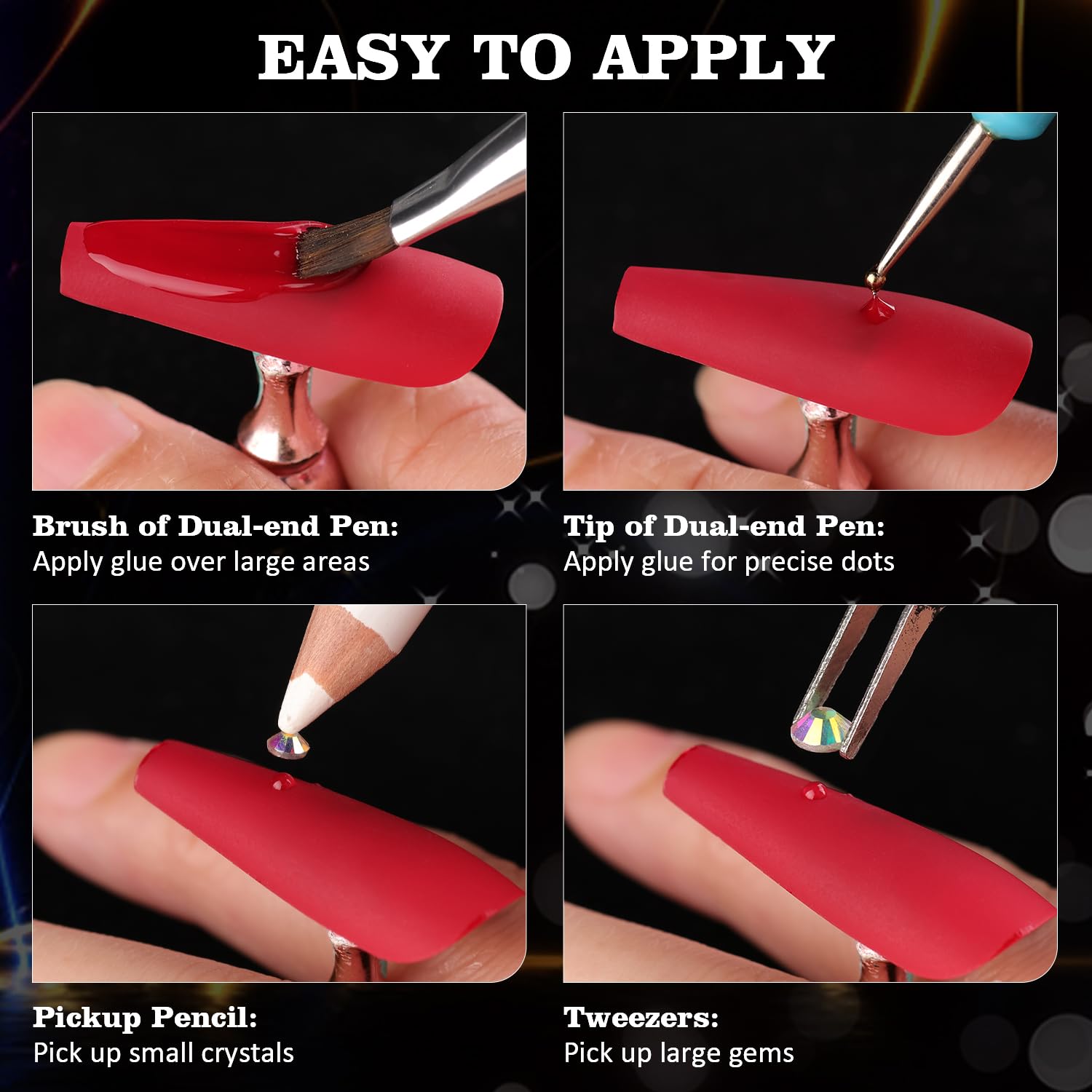 - đź’ŽMULTIFUNCTIONAL TOOLS -- The wide-head brush end of the dual-end dotting tool makes it easy to apply a large amount of your nail polish to the nail surface at once, while the other mini dotting end is great for detailed drawing. Picker pen can help you handily pick up small nail stones, while tweezer is a better choice for big beads. The flatback gems are not self-adhesive and glue-needed. (glue is not included.)