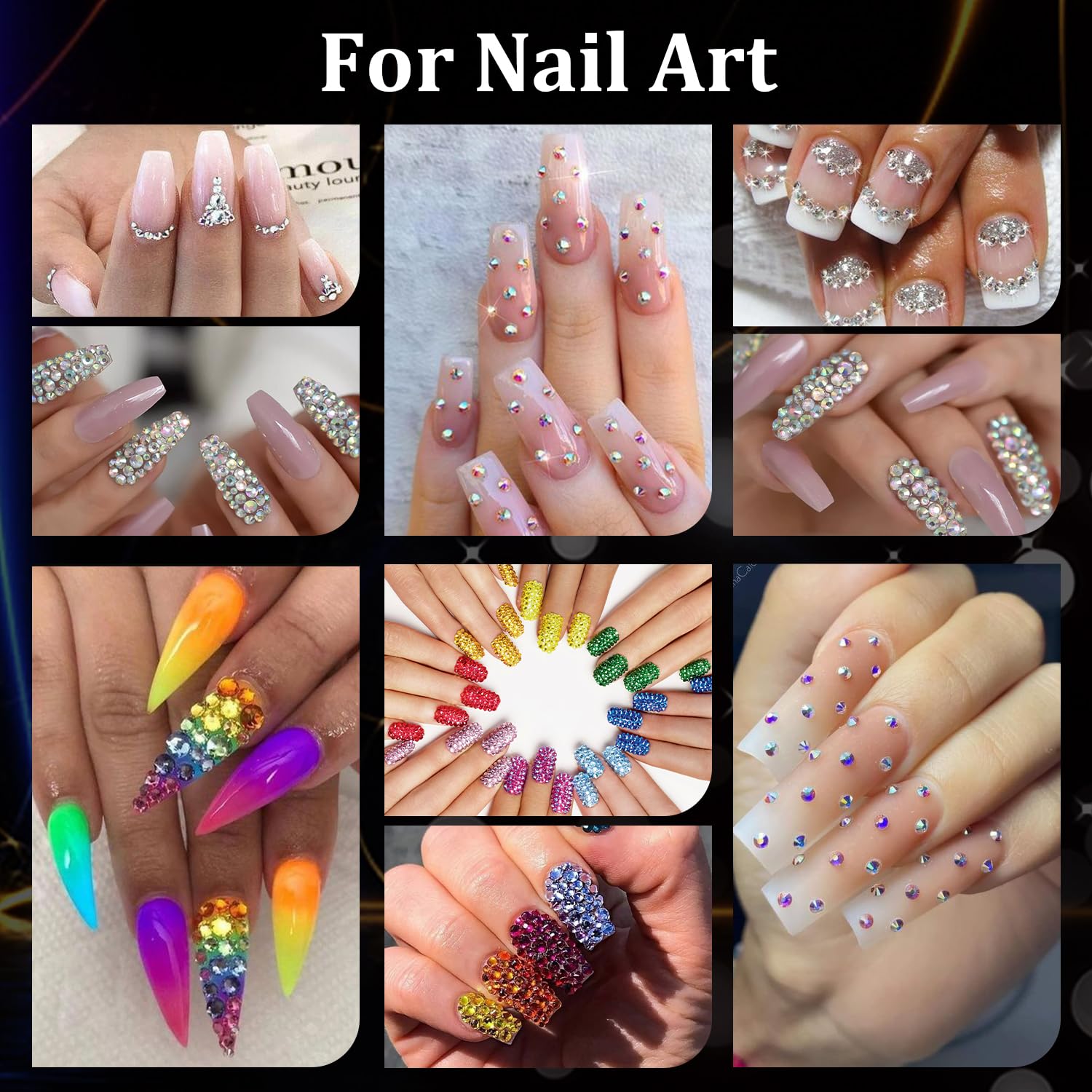 - đź’ŽSPARKLING BRILLIANCE FOR ALL -- The dazzling nail stones can decorate natural or acrylic nails, suitable for nail art beginners, hobbyists, nail tech, and professional manicure salons. We offer a wide size range, from 2mm to 5mm, that is perfect for your DIY nail art projects. You can get creative nail art shapes and patterns by mixing sizes and colors. Besides, the gems can be also used for eye or face makeup and crafting, such as bedazzling clothes, shoes, tumblers, and cards.