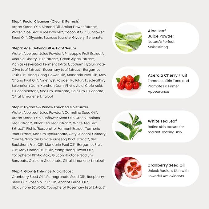 - A GLOWING FINISH. Step 4 - GLOW & ENHANCE FACIAL BOOST. Complete your transformation with liquid gold magic. The Enhance Glow Boost is a carefully crafted blend of organic oils, including cranberry, pomegranate, and raspberry seed. Infused with powerful fatty acids, antioxidants, and CoQ10 working harmoniously to enhance your skin's rejuvenation process, leaving you with a radiant, youthful glow. Step into science-driven skincare, where innovation and dermatologist expertise collide.