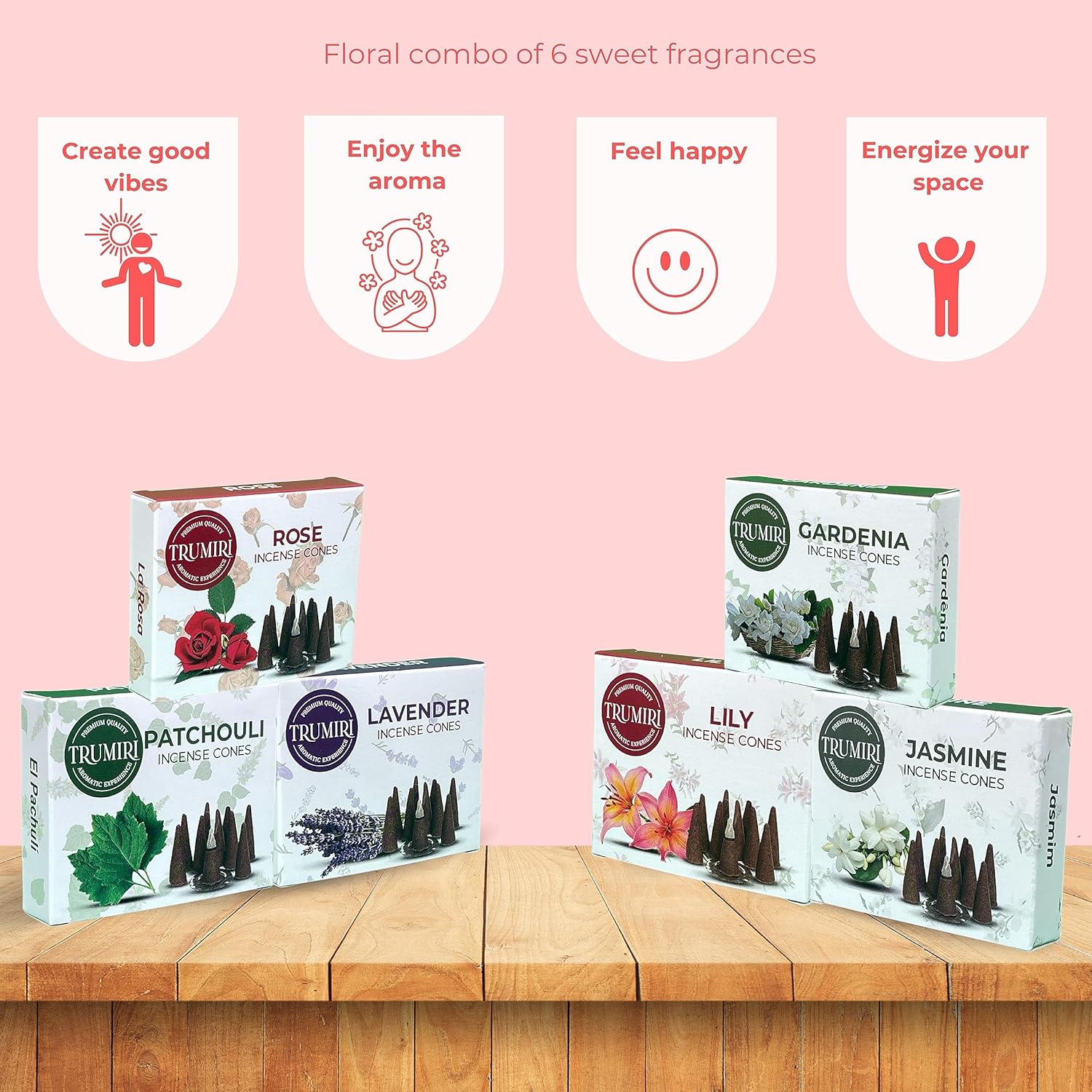 Trumiri Floral Incense Cones - Variety Pack - Total 60 Cone Incense (6 Scents x 10 Conos) - Rose, Lavender, Jasmin, Patchouli, Gardenia, Lily - Cone Incense Scents - Insense Cones - Incent Cone