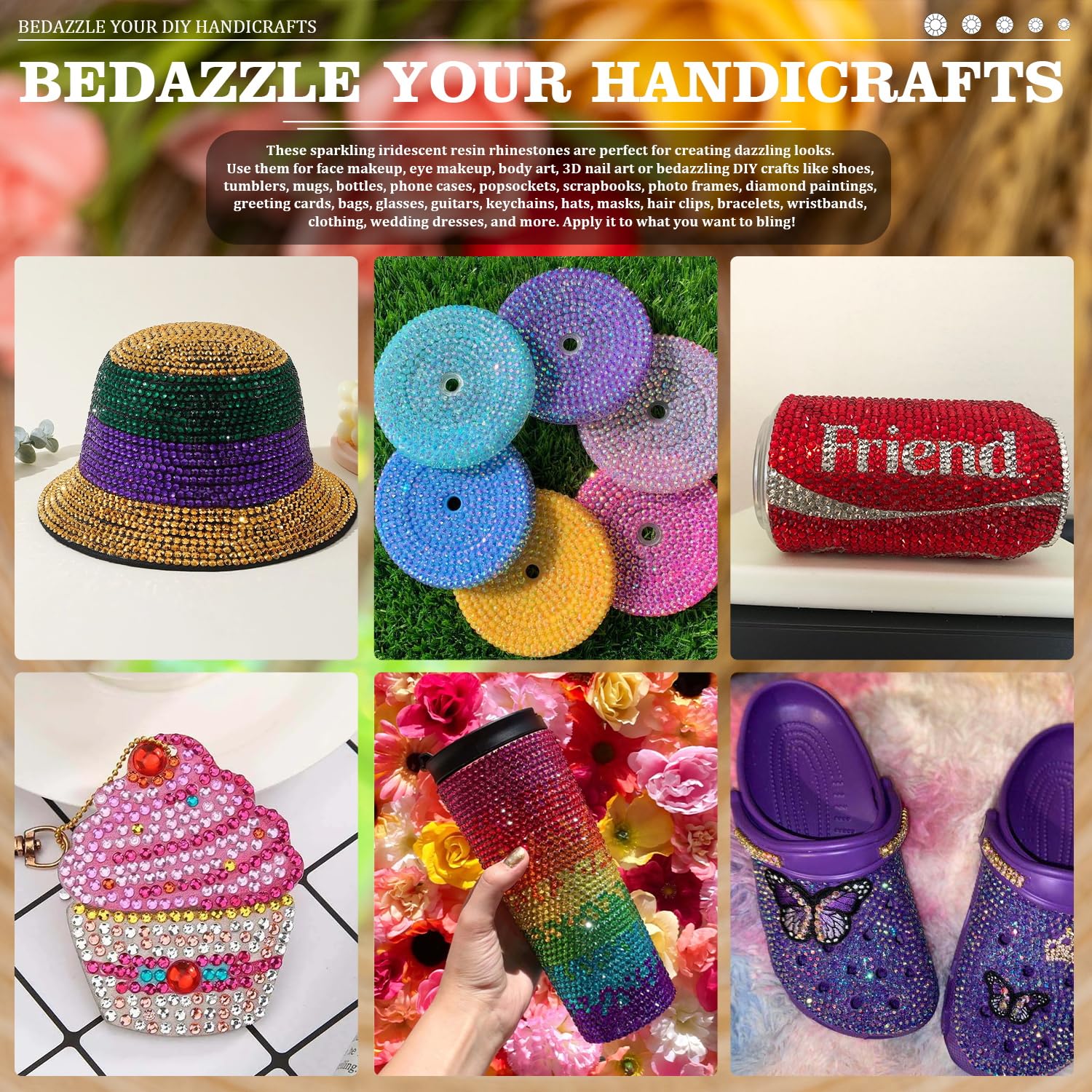 - đź’ŽWIDE APPLICATION -- These sparkling iridescent resin rhinestones are perfect for creating dazzling looks. Use them for face makeup, eye makeup, body art, 3D nail art or bedazzling DIY crafts like shoes, tumblers, mugs, bottles, phone cases, popsockets, scrapbooks, photo frames, diamond paintings, greeting cards, bags, glasses, guitars, keychains, hats, masks, hair clips, bracelets, wristbands, clothing, wedding dresses, and more. Apply it to what you want to bling!