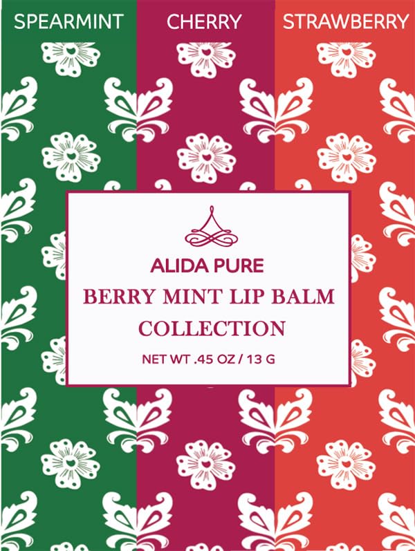 - ALIDA PURE Berry Mint Lip Balm Collection, is made with cruelty free, hypoallergenic, organic, and natural oils, that protect, and soothe. The delicious, soothing, and moisturizing, Berry Mint Lip Balm Collection, includes one tube each of Spearmint, Cherry, and Strawberry .15-ounce, lip balm tubes. Thoughtfully packaged with biodegradable materials that support the environment.