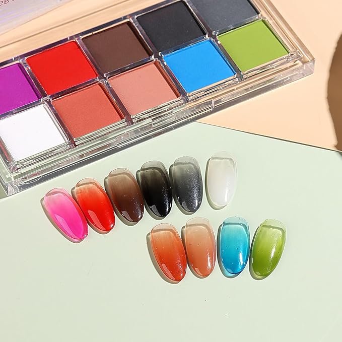 - 【YOU WILL GET】 10 colors in one palette solid nail powder and 10 doubled-head sponge sticks for rubbing nail pigment.