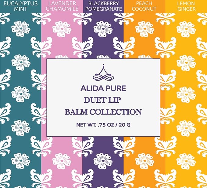 - ALIDA PURE Duet Lip Balm Collection is made with cruelty free, hypoallergenic, organic, and natural oils, that protect, and soothe. The delicious, nourishing, and moisturizing, Duet Lip Balm Collection includes a .15-ounce lip balm tube of Eucalyptus Mint, Lavender Chamomile, Blackberry Pomegranate, Peach Coconut, and Lemon Ginger lip balms. Thoughtfully packaged with bidegradable materials that support the environment.