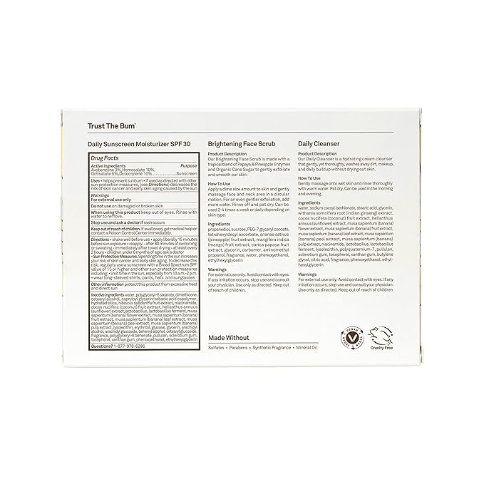 - KIT INCLUDES: 2 FL OZ Daily Cleanser, 1 OZ Brightening Face Scrub, and 1 FL OZ Daily Sunscreen Moisturizer SPF 30.