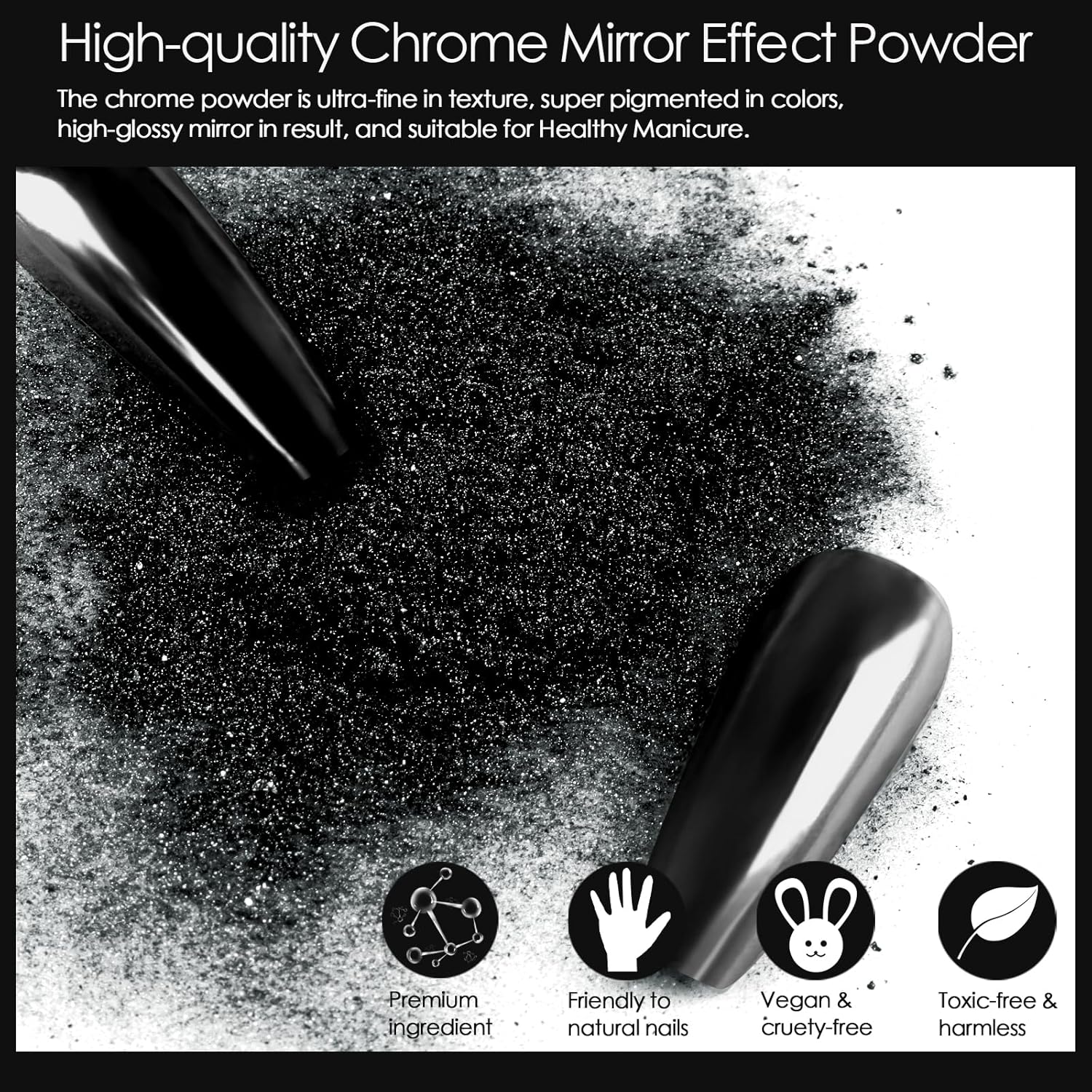 - Great Mirror Effect: It is an ideal black chrome nail powder and silver chrome nail powder kit to create a mirror effect, water ripple effect, bubble effect, star effect for your acrylic extensions, gel extensions, and gel polish manicures. The chrome glitter has delicate powder and attractive luster, which makes it have an excellent mirror effect. Create your unique nail art with Allstarry holographic chrome manicure pigment.