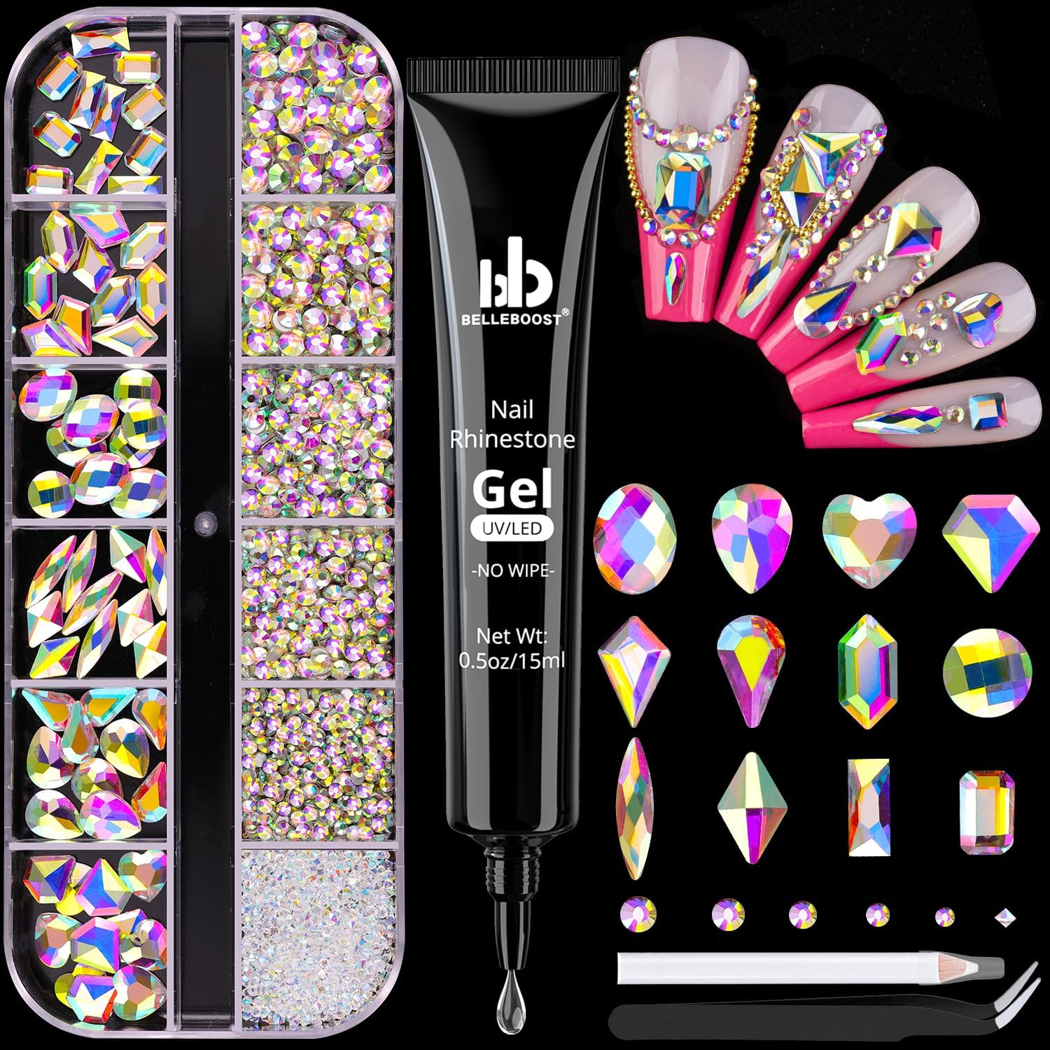 2060Pcs AB Glass Nail Rhinestones 60Pcs Multi Shapes Flatback Nail Gems + 2000Pcs 1.5-4mm Round Crystal with Rhinestones Glue Gel, Manicure Nail Charms Diamond Gemstones for Nail Art