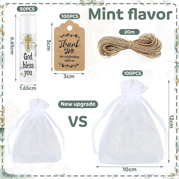 - Nice Lip Balm Combination: the package includes 50 pieces of mint flavor lip balms with 100 thank you tags, 20 meter long cord, and 100 pieces of white transparent organza gauze bag, the sufficient quantity is enough for the wedding supplies, baby shower favors and bridal shower favors