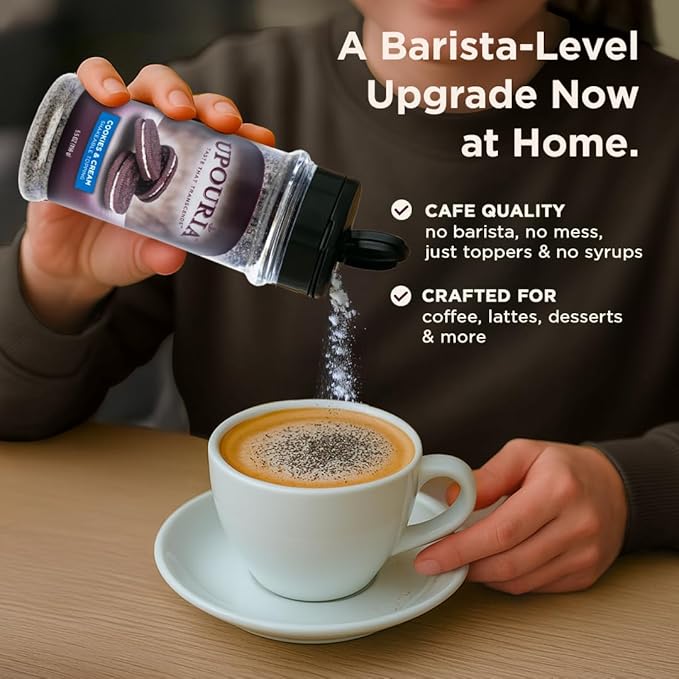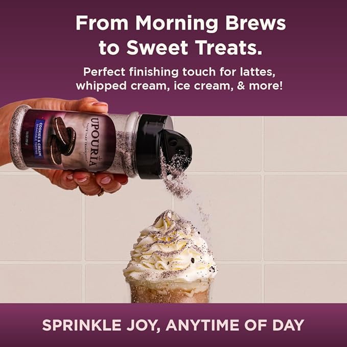- EXQUISITE COOKIES & CREAM EXPERIENCE: Transform your everyday coffee or hot chocolate into a decadent experience with our rich, cookies & cream topping. A single shake brings out a symphony of flavors.