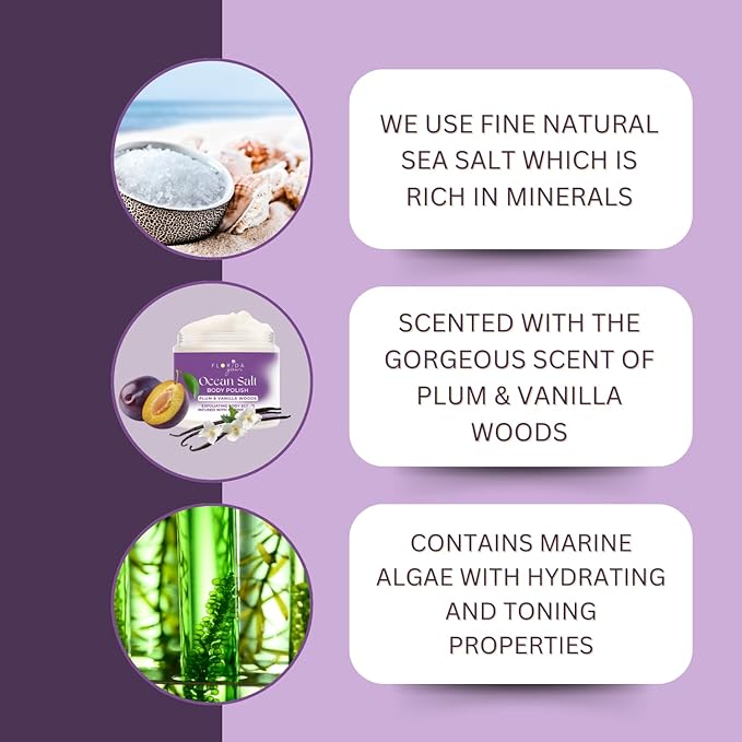 Sea Salt Body Scrub by Florida Suncare - Ocean Salt Body Polish Infused with Marine Algae - Exfoliating Face and Body Scrub -Facial Scrub Exfoliator to Tackle Acne, Scars (Plum & Vanilla Woods, 3.3oz)