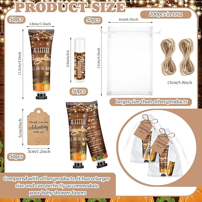 - Pumpkin Baby Shower Guest Gifts: whether for a baby shower party, birthday, wedding, anniversary or simply as a treat for yourself, the package includes 50 each of pumpkin theme hand lotions, lip balms, organza bags, kraft paper tags with hemp ropes that add a splash of elegance to your gift setting