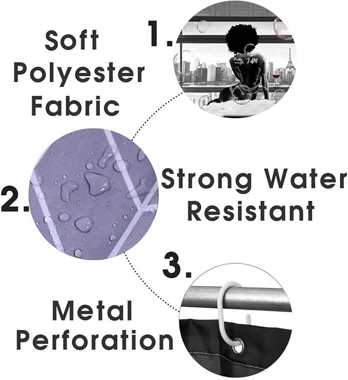 4PCS Sexy African American Women Shower Curtain Sets with Rugs, Waterproof Fabric Black White Shower Curtain, Hello Gorgeous Positive Quotes Black Girl Afro Black Woman Fashion Bathroom Decor