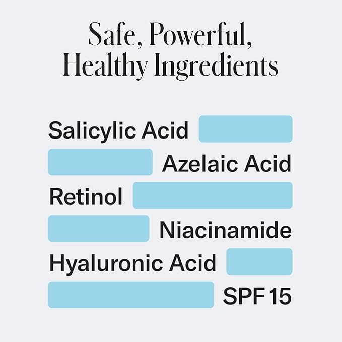 - SAFE, POWERFUL, HEALTHY INGREDIENTS: No Benzoyl Peroxide. A dermatologist-tested formula including Salicylic Acid, Azelaic Acid, Hyaluronic Acid, Niacinamide, and the most advanced level of Retinol will help prevent new breakouts and heal acne scarring.