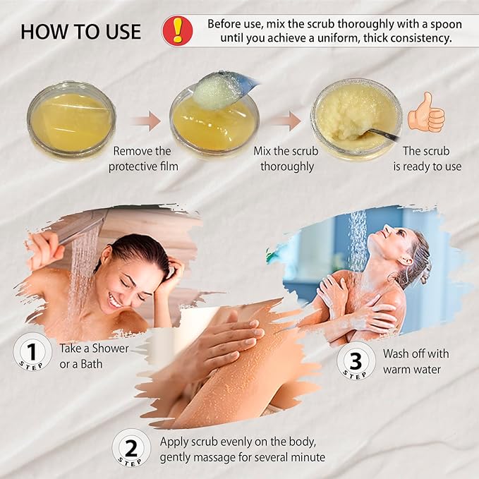 - How to use - before using the scrub, thoroughly mix it to ensure even distribution of the oil and exfoliating particles. Wet your skin with warm water to open the pores, then apply the scrub to damp skin, gently massaging in circular motions. Rinse with warm water and pat your skin dry with a towel. Allow the remaining oil to absorb, avoiding additional moisturizing. This will maximize the effect of the treatment, leaving your skin soft and hydrated.
